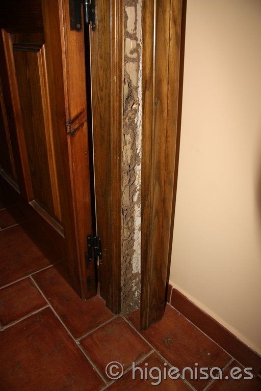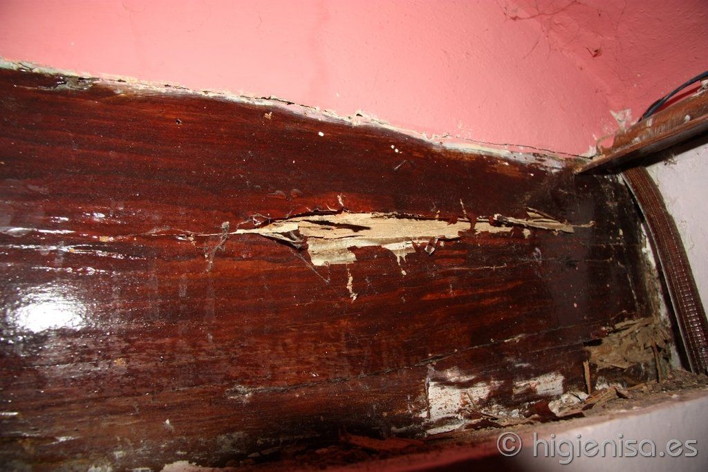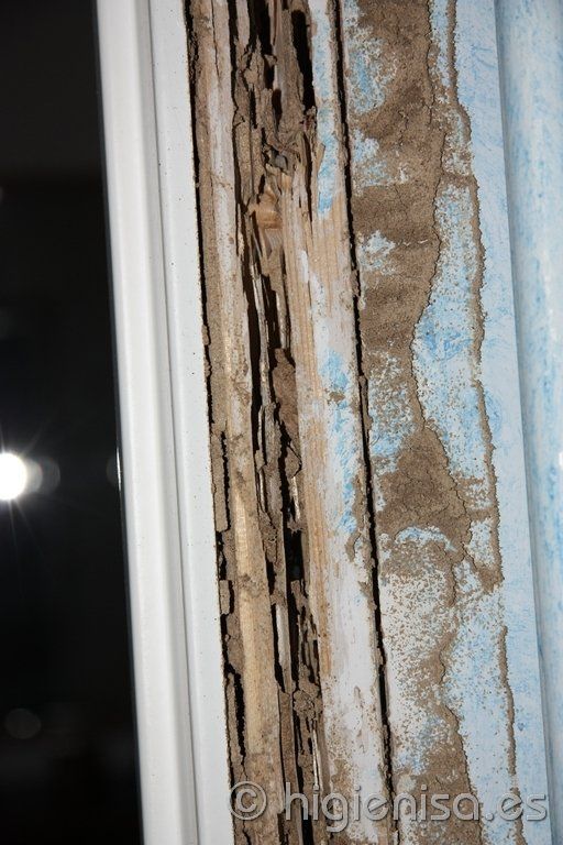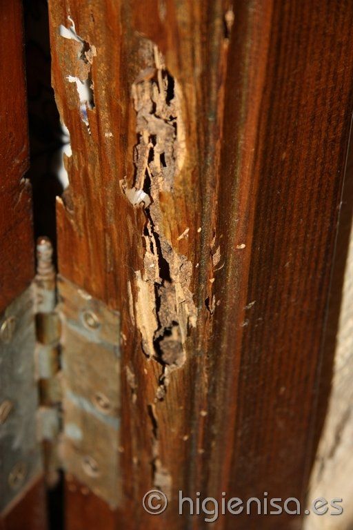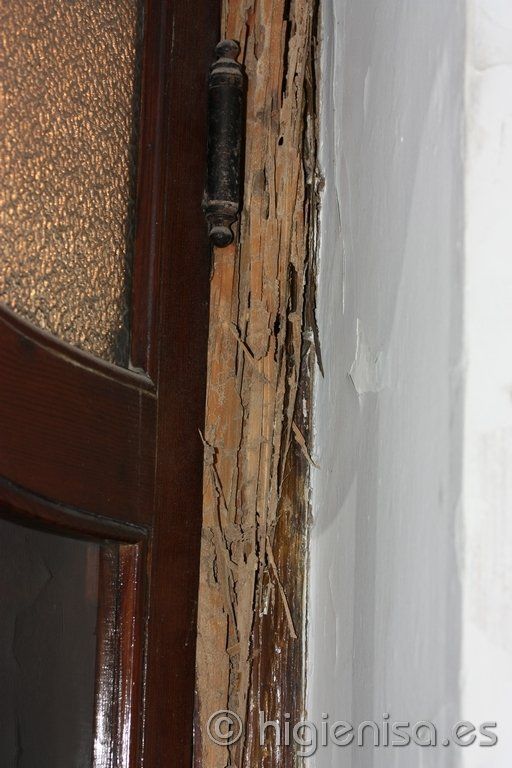 A continuación se muestran imágenes de ataques de termitas en marcos de puertas, rastros de termitas en vigas de madera, etc. para reconocer sus ataques. Estas fotos de termitas, rastros y ataques te ayudarán a detectar termitas en casa, identificando los ataques en la madera de marcos de puertas, vigas, etc.